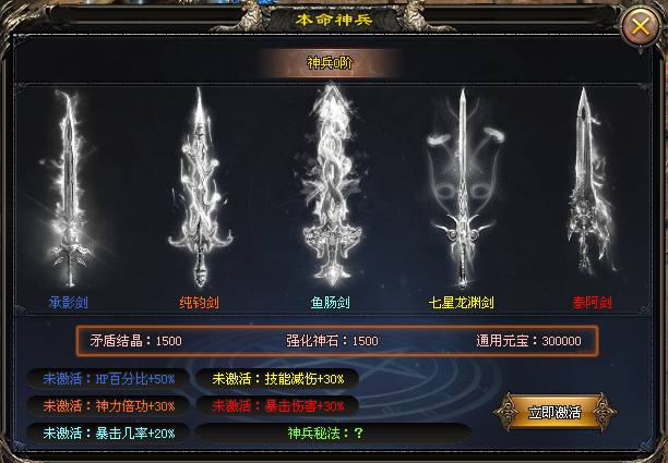 该神兵极其强大,不同神兵增加特殊不同属性加成,暴击几率,神力倍攻,HP百分比等。