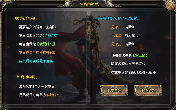 在游戏内与游戏内的兄弟结义,最高可结义三人!增加人物全属性的同时,可实现兄弟相互传送,从此不在孤立无援。