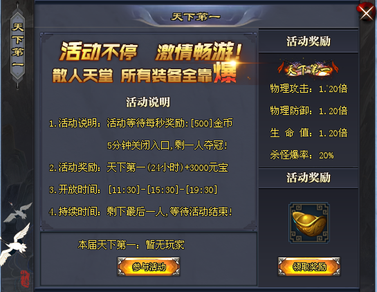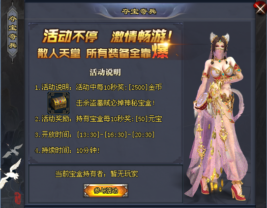 活动内容:1)活动中每10秒奖:2500金币;2)持有宝盒每10秒奖:50元宝;3)活动胜利者奖励金币、元宝、觉醒石以及技能书。