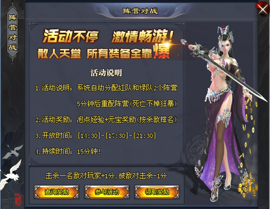 活动内容:1)参与活动自动分配:红队/绿队;2)不掉狂暴,击杀敌对玩家加1分!