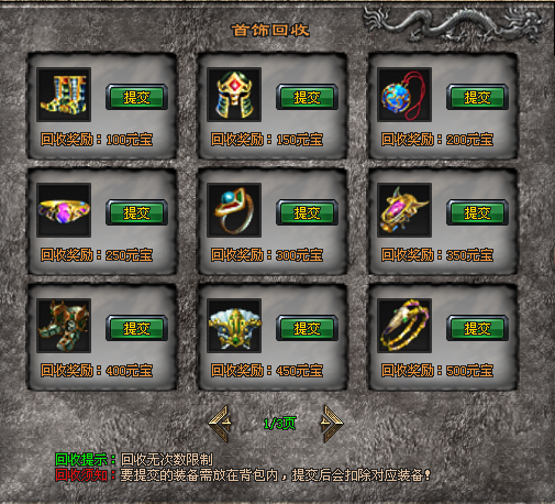 打到多余的装备可以在这里一次回收,回收无次数限制,要提交的回收装备需放在背包内,提交后会扣除对应装备,回收会给与一定的元宝奖励。