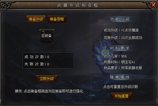 吞噬:完美升级20次才可进行吞噬,吞噬失败不破碎,必要:钢玉石+1%几率,吞噬20次激活隐藏属性,仅限稀世武器衣服。