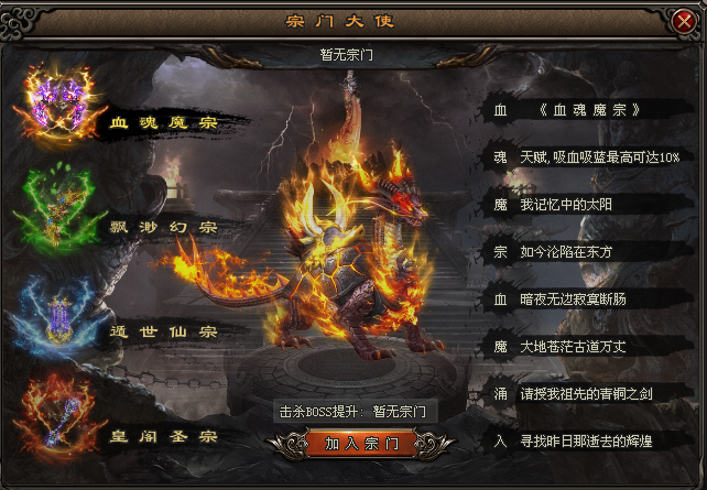 玩家选择加入不同宗门获取不同击杀BOSS提升,附加属性天赋,吸血吸蓝最高可达10%。