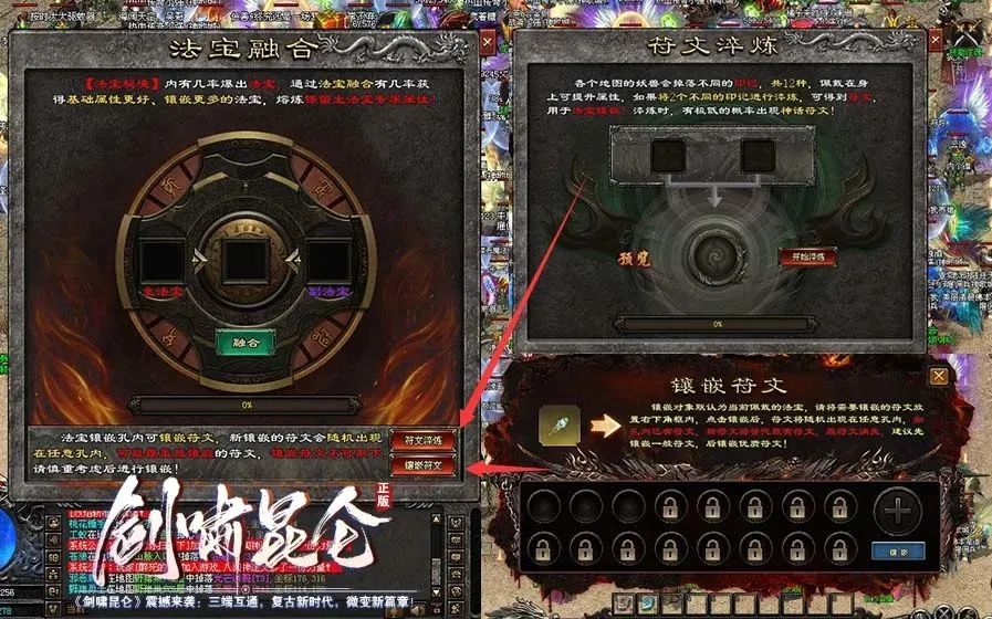 勋章玉佩勋章可在逍遥子NPC处使用乾坤石抽取,运气好可抽到神级勋章。玉佩可在玉石商人处合成,主要材料是碎玉。合成帝皇神玉后可进行开光,从而获得更好的属性。乾坤石和神龙币均产自各大BOSS,高级BOSS死亡必爆。无之盾牌昆仑道人会送给初入江湖的你一枚可生长盾牌,随着击杀怪物数量增加,盾牌会不断升级,随机获得更高的属性加成。星座宫殿可爆出仙葫芦,存储历练值。存满后释放,可快速提升盾牌等级。神之羽翼每个职业都有专属羽翼,通过材料进阶为更高级羽翼。随着等级提升,翅膀会变得更强大。翅膀是幸运一击属性的主要来源,人物幸运一击达到100%后,每次攻击均发挥最大伤害。装备提升普通套装主要由整套的鞋子、腰带、手镯、戒指、项链、头盔、衣服组成。手镯和戒指部位可额外佩戴神秘套装,使用神秘残页在神秘使者处融合(神秘残页由精英怪以上级别掉落)。装备分解所有装备均可分解为材料。经验玉用于提升等级,金刚石用于强化装备,钻石用于装备洗练。无任何门槛,随时随地分解掉落装备。开启自动分解后,当背包剩余空格不足10格时,将启动分解。★ 升级攻略技能注魂每个职业均有6个可注魂技能。通过技能魂石的注入,改变技能的形态和性质,从而获得强大的战斗力。每个技能分别有2种注魂形态,打开乾坤袋可获得技能魂石。多余的魂石可回收成碎片,凑齐足够的碎片可兑换指定的技能魂石,收集十二生肖和天数残页可兑换乾坤袋。丹药炼制桃花岛地图每2小时刷新一批稀有药材,收集药材可在炼药师处炼制丹药,成功炼制获得随机一种丹药。随着炼制次数的增加,炼制药品的等级也会不断提高。药品可提升人物属性、恢复血量、解除异常状态等。轮回转生等级达到70级即可进行转生,转生后获得属性加成。每次转生会将等级降低至50级,同时降低经验玉收益。建议转生前多准备经验玉,以便快速提升等级。高级转生后,可通过打怪加经验玉的方式提升等级。法宝镶嵌通过融合法宝,最多可获得16个镶嵌孔,每次融合可获得的随机最大孔数为主副法宝自带镶嵌孔的总和。孔内可镶嵌符文,符文由怪物掉落的印记淬炼而成。不同的印记组合会淬炼出多样符文,基础符文共66种,淬炼有几率出现神话符文。法宝融合挑战密境会获得密境碎片,收集一定的碎片可兑换法宝。法宝主属性随机,可镶嵌孔随机,每个镶嵌孔均可镶嵌符文。通过2个任意法宝融合可改变法宝的属性和镶嵌孔的数量。