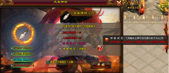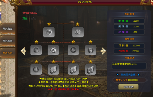 增加人物切割、血量、攻击、防御。提升到一定等级可开通稀有技能(超级连爆和神兽威压)材料可以通过打怪获取!
