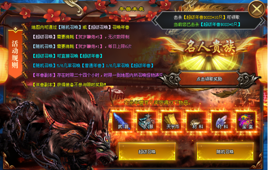 进入地图通过贺岁鞭炮召唤年兽,击杀就可以获取装备、稀有材料、货币!
