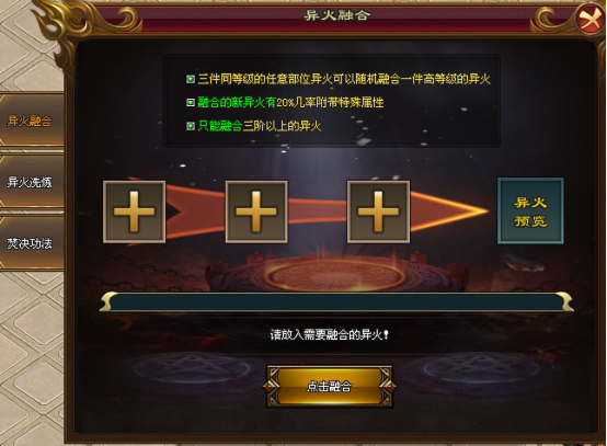 三件同等级的任意部位异火可以随机融合件高等级的异火,融合的新异火有20%几率附带特殊属性,只能融合三阶以上的异火(异火只能打高级BOSS获取)