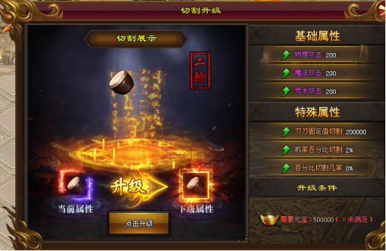 提升攻击、切割、切割百分比!提升条件元宝提升,元宝可提供打怪回收装备获取