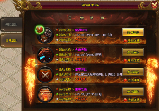 活动说明:活动开始后地图刷出大量材料道具及世界BOSS-只!世界BOSS爆率超高,非常给力!随着开区时间越久爆率越高BOSS爆出物品所有人都可以捡取