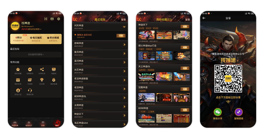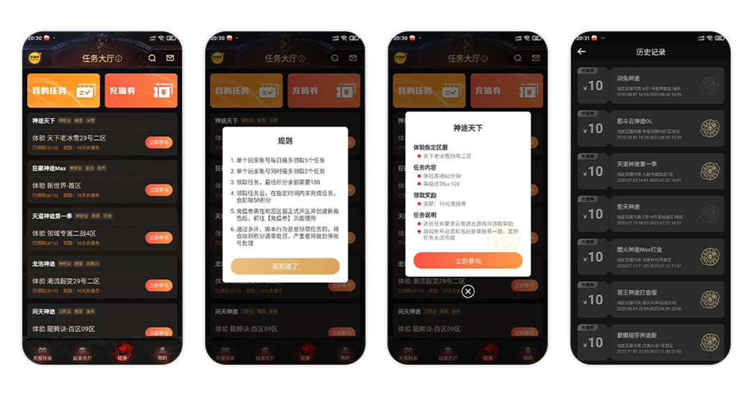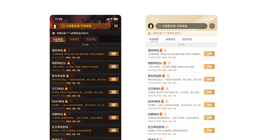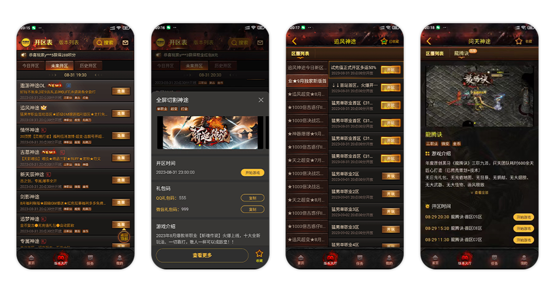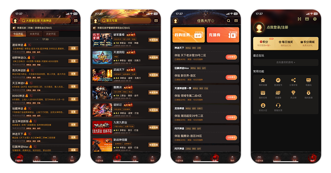 ▲ APP深色模式、浅色模式 ▲ APP新版导航,操作更便捷 根据用户反馈新增版本大厅,可以通过底部导航栏选择不同的找服方式,开服列表按开服时间找服,版本大厅按版本类型找服。精准分类,找服更合心意。新增任务,可以通过底部导航栏「任务」快速进入任务领取页面,参与新服体验,免费领取相应游戏充值券。 ▲ APP任务赚金,积分商城兑好礼 新增任务赚金模块,每日签到、游戏任务、邀请好友、优质点评,完成任务即可获得积分。积分可用于每日抽奖抽取微信现金红包,以及积分商城兑换各种新款产品,兄弟们冲就对了!可以从「我的」页面头像下方进入任务赚金、每日抽奖,以及积分商城。 【礼】点击区服信息条查看礼包码信息 【详】点击选服右滑查看版本攻略 【火】区服开区时间临近 【NEW】新游戏首次开区 【皇冠】游戏运营商连续运营年份,品牌实力铭牌 【任务】——参与新服任务得充值 任务大厅有超多任务等你参与,点击「任务信息条」可以查看任务体验指定区服、任务内容、奖励和说明,完成任务要求后退出游戏即可领取充值券奖励。既能体验游戏又能获得充值,可谓一举两得。已参与的任务可以点击「我的任务」查看,已领取的游戏充值券可以点击「充值券」查看。 【我的】——使用体验再次升级 ▲ APP我的导航,十大功能更好用编辑搜图