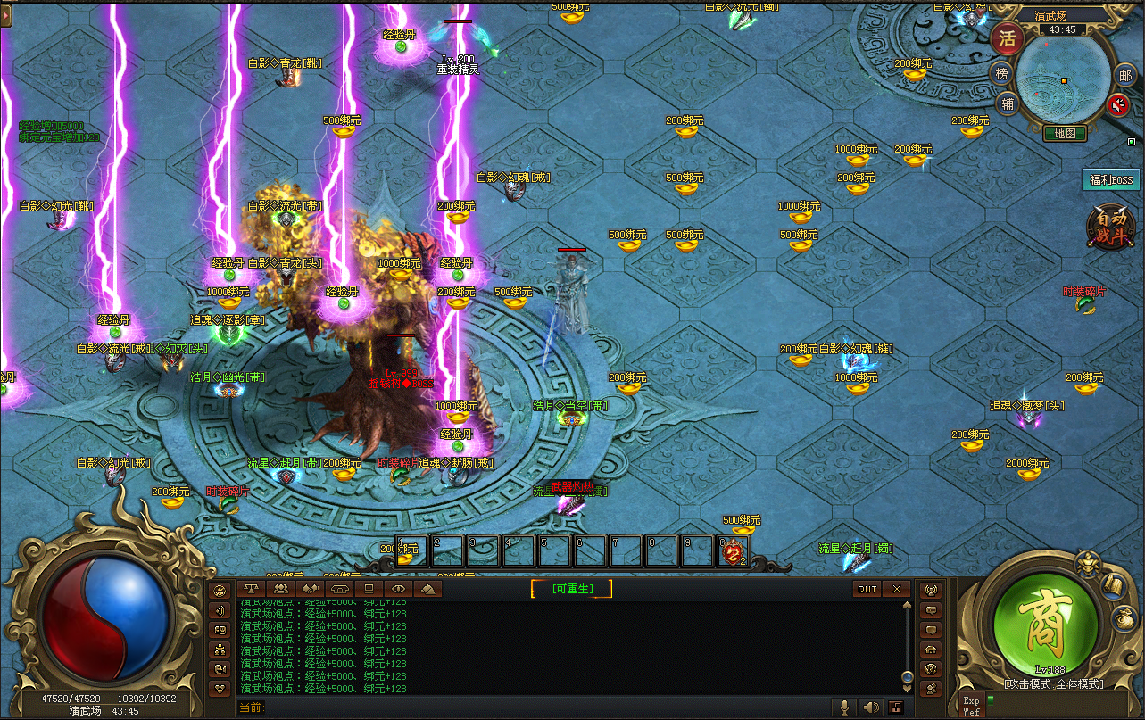 2)福利BOSS:每小时6只,50%几率掉落一元充值,另外每次新区有24*次首杀名额,每次奖动388元宝。