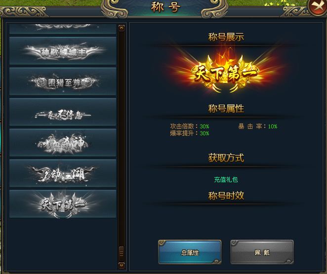 玩家佩戴不同称号,获得属性暴击,攻击伤害,生命大幅度增加,需要充值兑换。