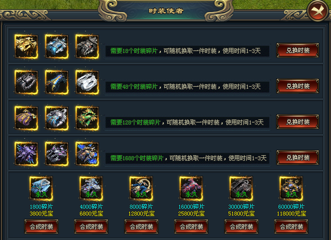 玩家可通过元宝或时装碎片合成随机时装一件,增加大量属性,提升战斗实力。