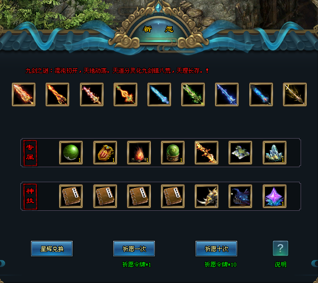 每购买一个星辉赠送一个祈愿令牌,祈愿累计10次赠送涅槃之火一个,除九剑祈愿概率为必定,其他所有物品概率均为平均概率。