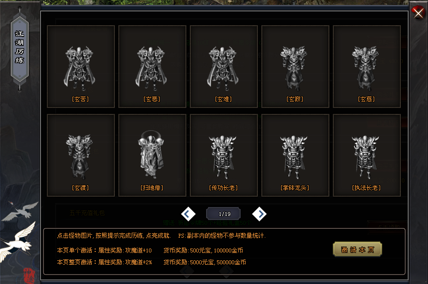 玩家通过每件装备增加2点当前页收藏进度,共计五页装备,完成收藏进度,获得攻魔道上限增加10%,打怪爆率提升至100%,增加大量生命值。