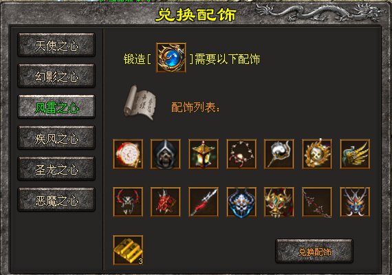 特色配饰收集玩法,配饰都是从小怪,精英,教主,爆出,收集各个种类的配饰可兑换六大神心,超级配饰。