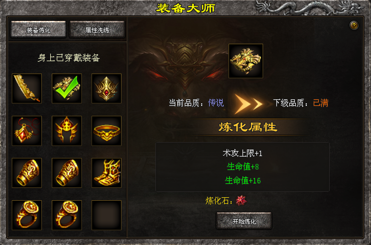 炼化后的装备可在此功能内进行重新洗炼,每次洗炼都将自动清除原有属性,覆盖新的洗炼属性。