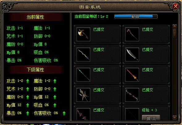 图鉴收集,提交装备可以获得图鉴经验,图鉴经验达到一定数值可以升级图鉴等级,图鉴等级可以获得人物属性。